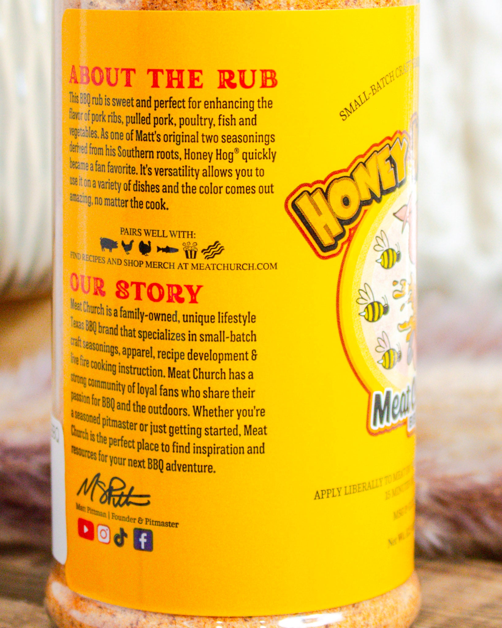 This BBQ rub is sweet and perfect for enhancing the flavor of pork ribs, pulled pork, poultry, fish and vegetables. As one of Matt’s original two seasonings derived from his Southern roots, Honey Hog quickly became a fan favorite. It’s versatility allows you to use it on a variety of dishes and the color comes out amazing, no matter the cook.