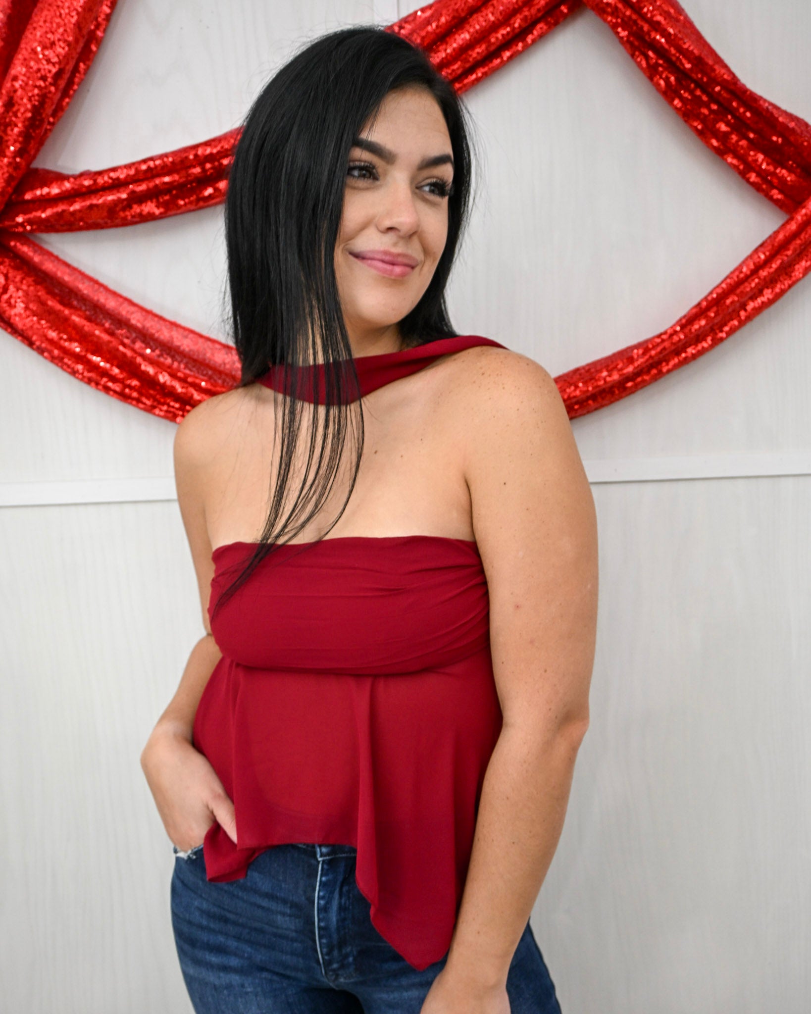 Bold, feminine, and undeniably captivating—the Crimson Kiss Smocked Back Top is made for moments when you want to stand out without saying a word. Featuring a strapless silhouette paired with a built-in choker neckline, this top creates a striking, fashion-forward look that feels both modern and timeless.