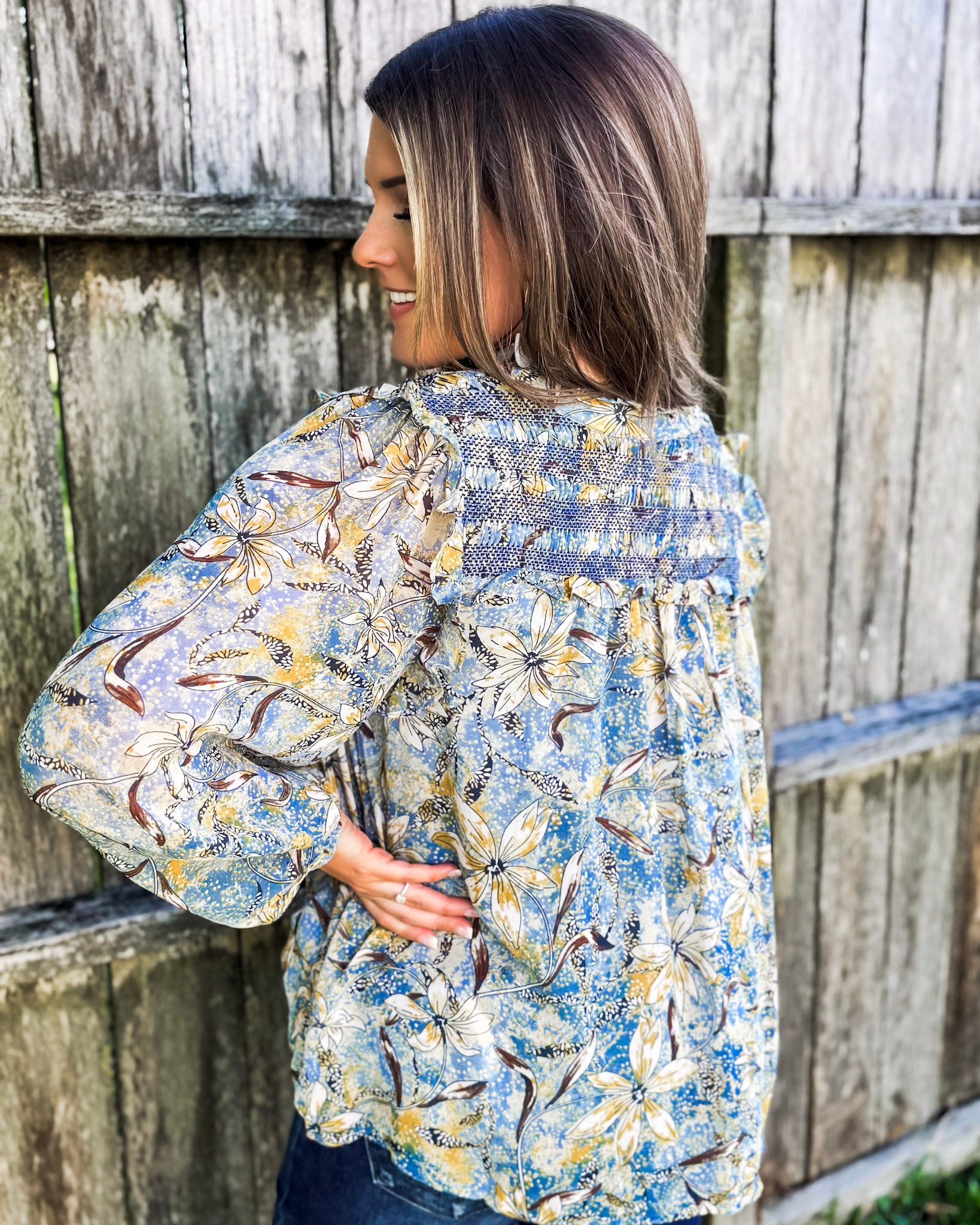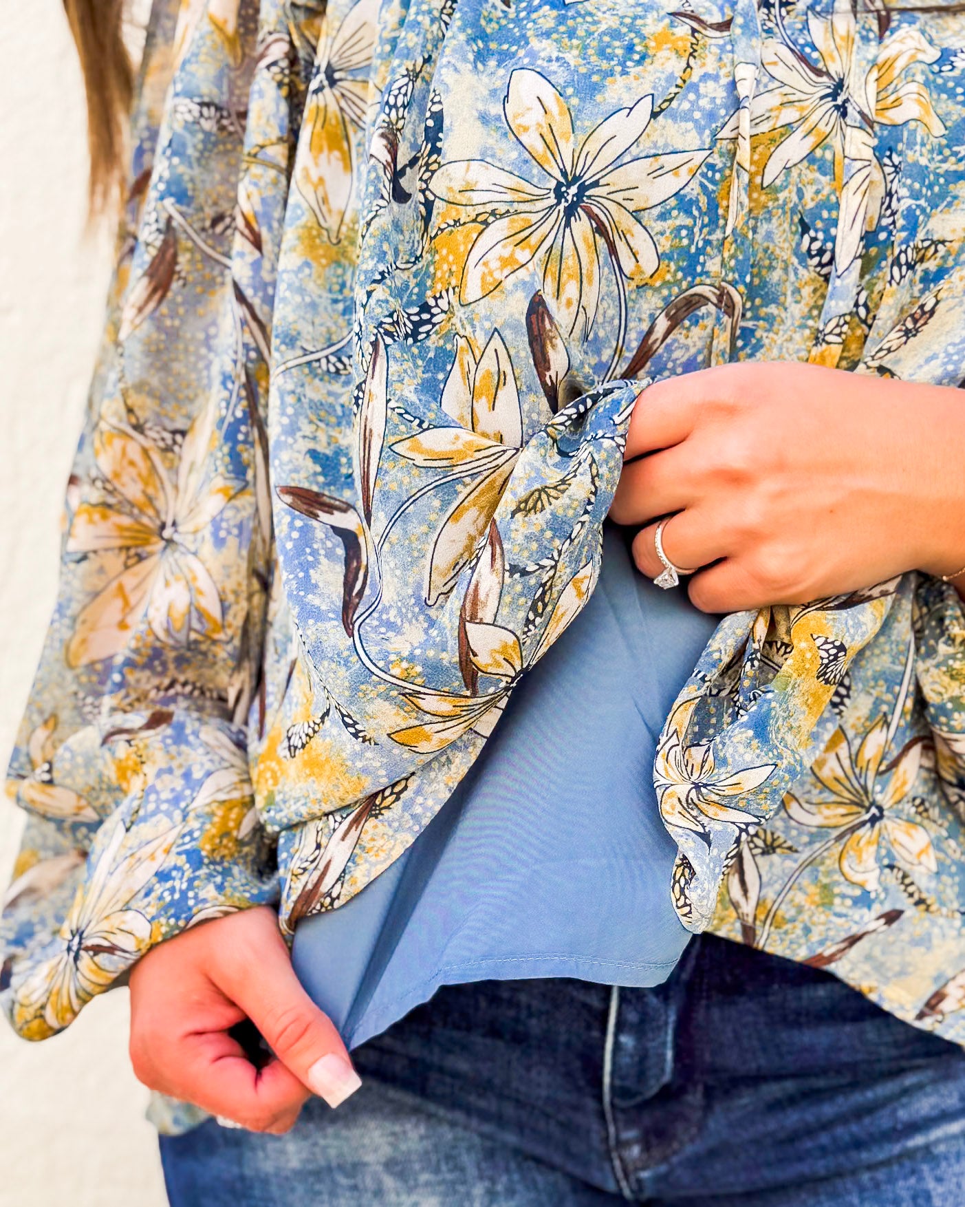Meet your new favorite “wear-anywhere” top — The Eloise Blouse. Designed with a dreamy floral print in shades of soft blue, gold, and cream, this blouse brings effortless charm to your everyday wardrobe. The lightweight fabric drapes beautifully for a relaxed, flattering fit that transitions seamlessly from the office to dinner plans.