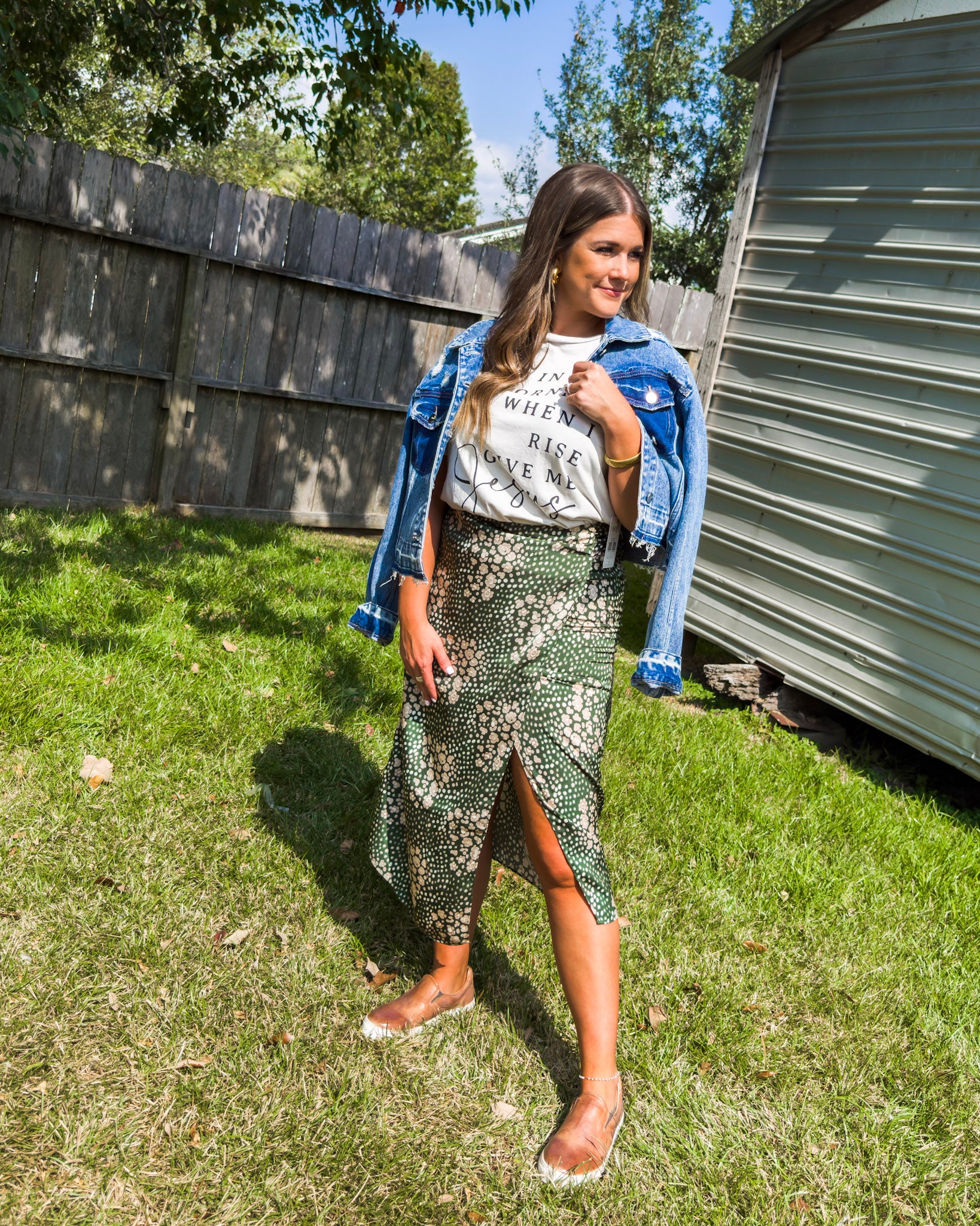 Add a touch of effortless charm to your everyday look with the Clover Skies Midi Skirt. Featuring a silky-smooth finish and an abstract floral print in soft cream against a deep olive base, this skirt strikes the perfect balance between timeless and trendy. The flattering midi length and side slit make it easy to style for any occasion — pair it with a graphic tee for a casual vibe or a sweater and boots for a dressed-up fall look.