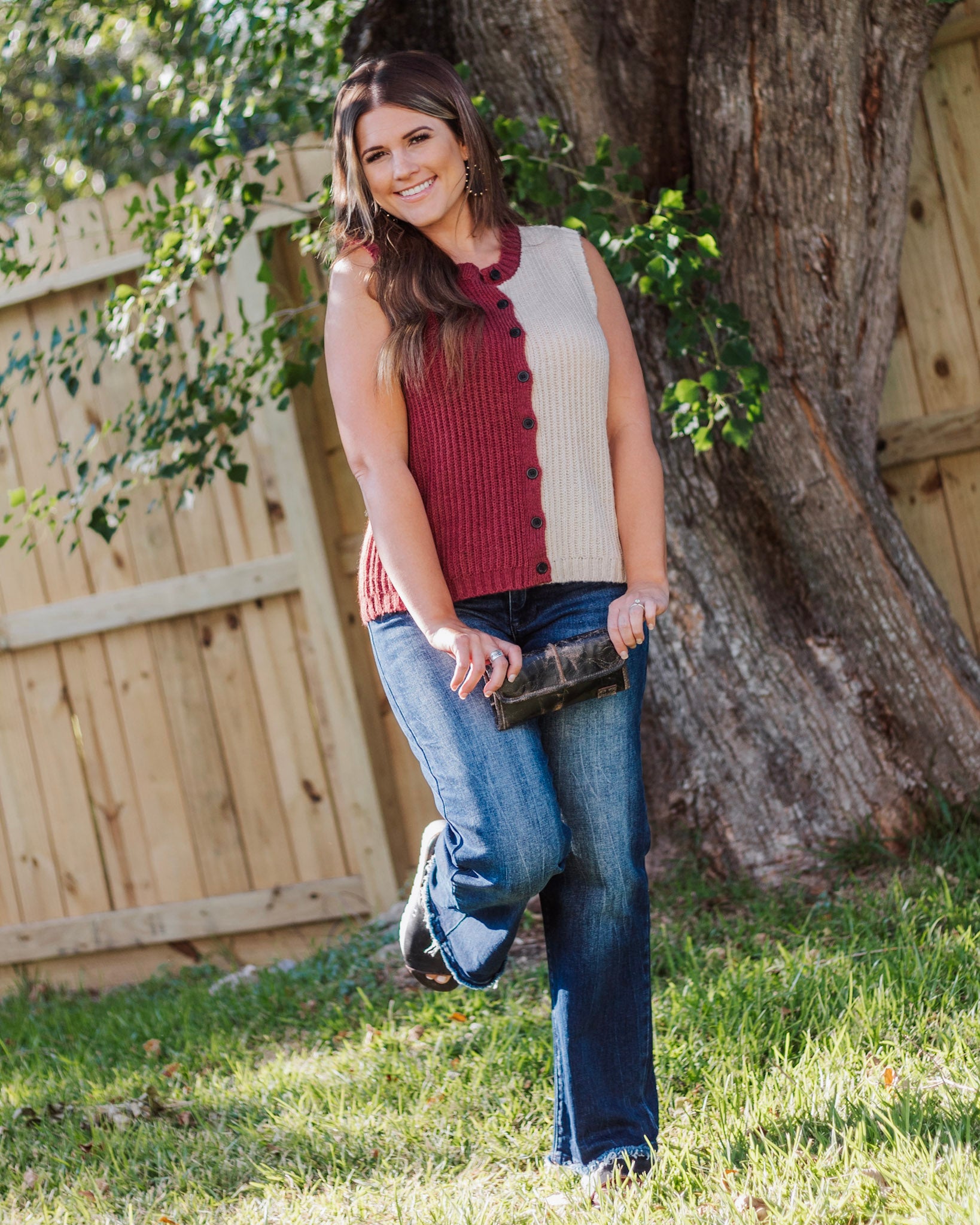 Give your fall wardrobe a playful refresh with our Split Decision Knit Vest. This sleeveless knit top features a bold wine and oatmeal two-tone colorblock design with contrast buttons, adding the perfect pop of cozy texture to any look. Designed for transitional weather and layering ease, this boutique-worthy piece balances comfort with statement style. Pair it with flares, denim shorts, or trousers for instant boutique flair.