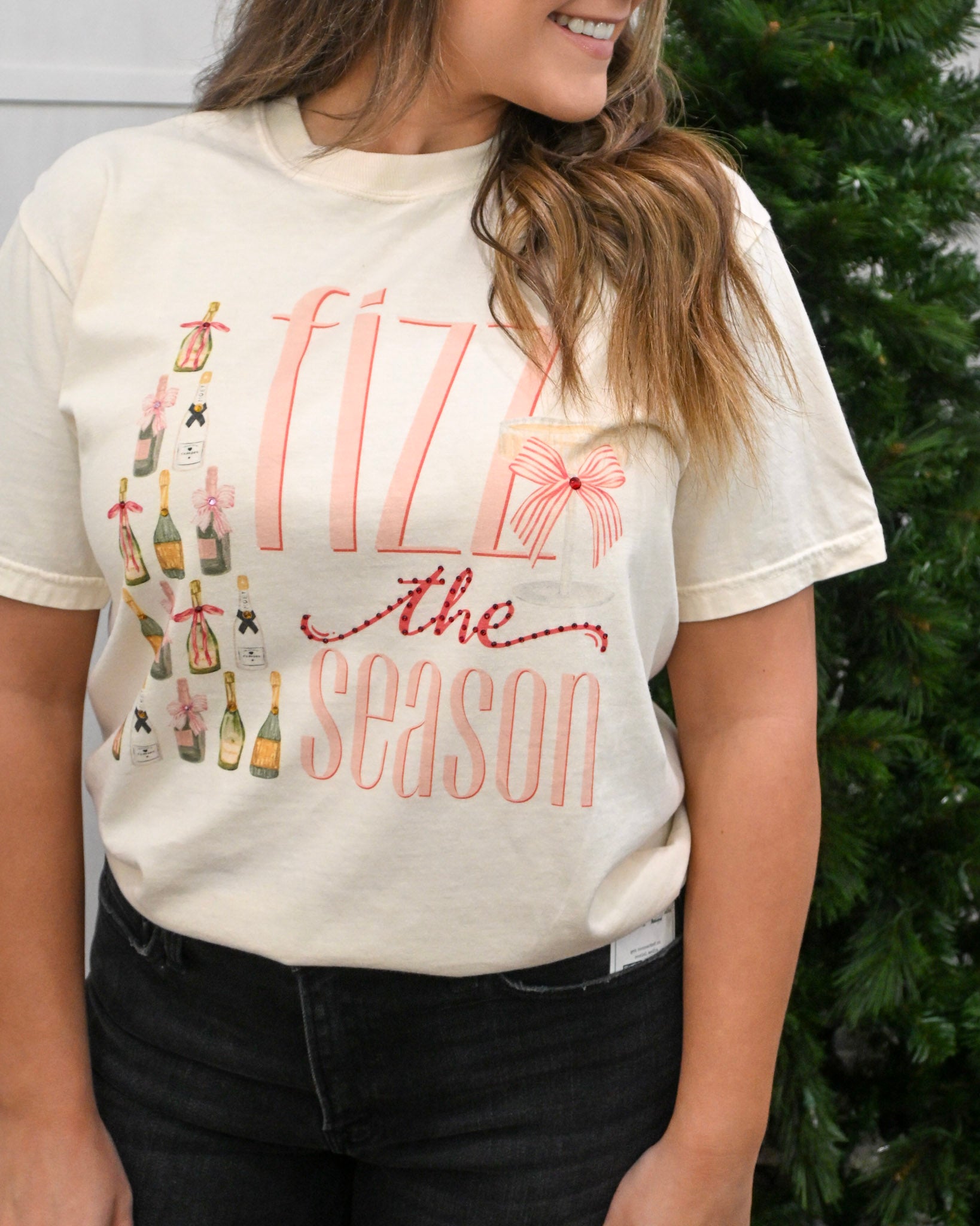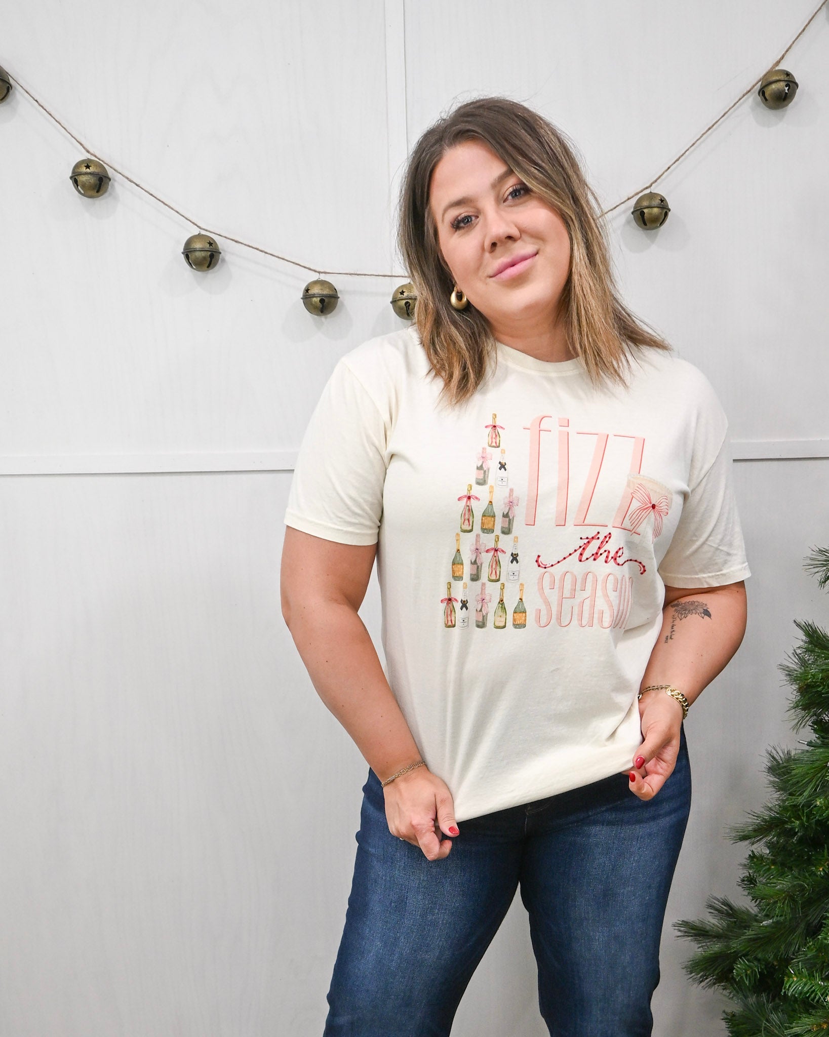 Celebrate the season with a little sparkle in our Fizz, Pop, Clink Graphic Tee! This festive graphic tee features a bubbly holiday-inspired print with champagne bottles, bows, and soft pastel accents — all on a cozy cream backdrop that pairs effortlessly with denim, skirts, or your favorite holiday layers. Cute, comfy, and full of cheer, it’s the perfect tee for parties, gifting, or adding a little fizz to your everyday style.