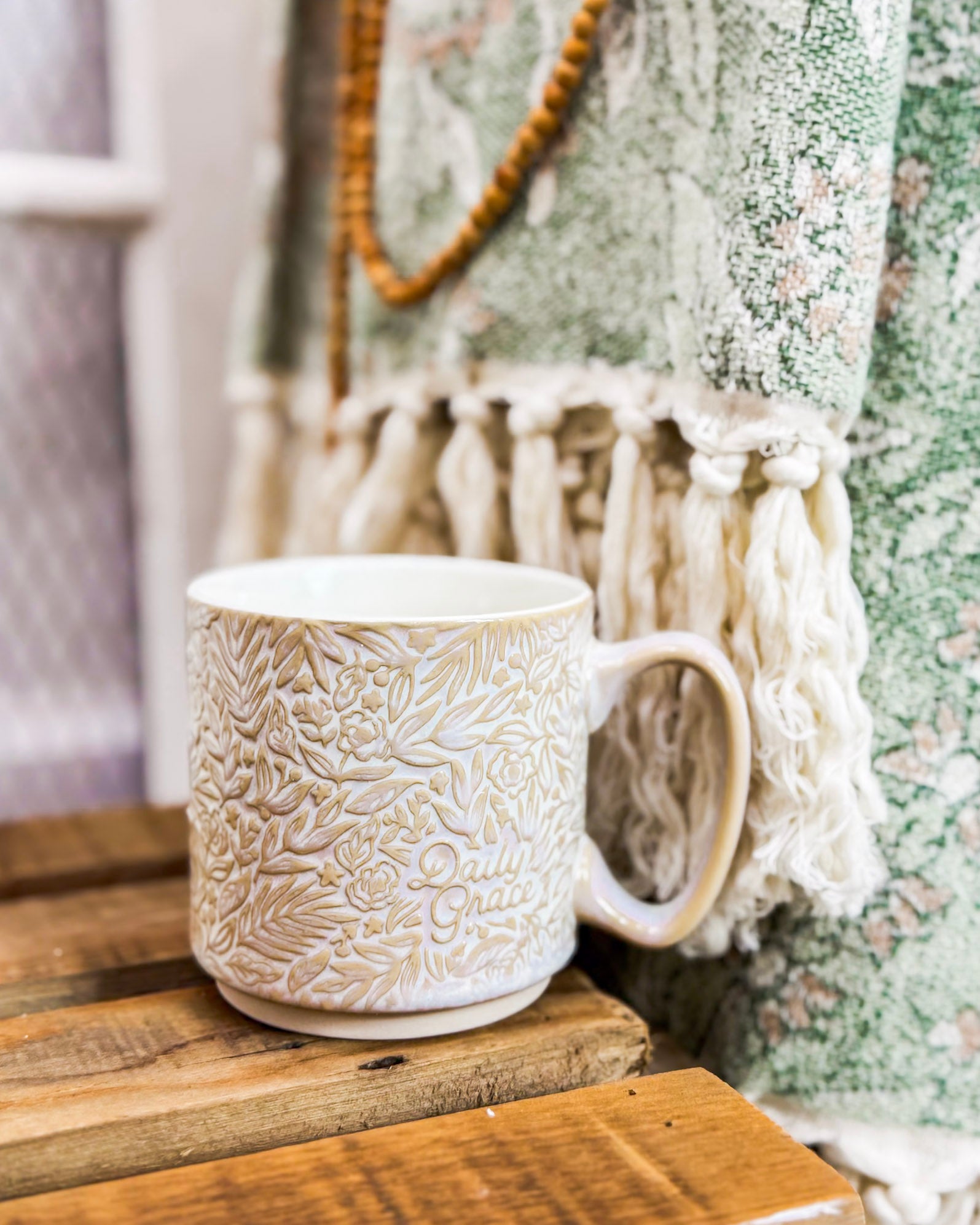 This mug features a beautiful cream-colored base with custom designed floral illustrations and script imprint.