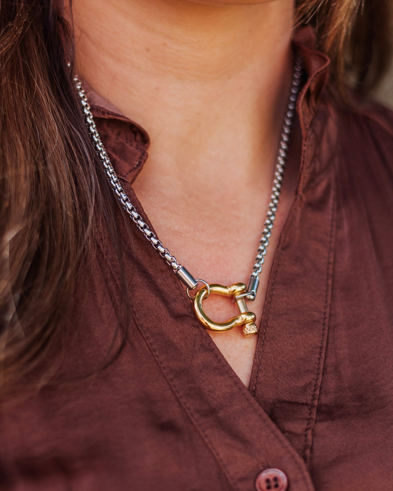 Add a bold, statement-making touch to any outfit with our Locket Necklace in a mixed metal.. This edgy piece features a chunky silver-tone chain and an industrial-inspired gold clasp at center stage. Perfect for layering or wearing solo, it's a modern accessory that balances strength and style—making it a staple for your fall wardrobe and beyond.