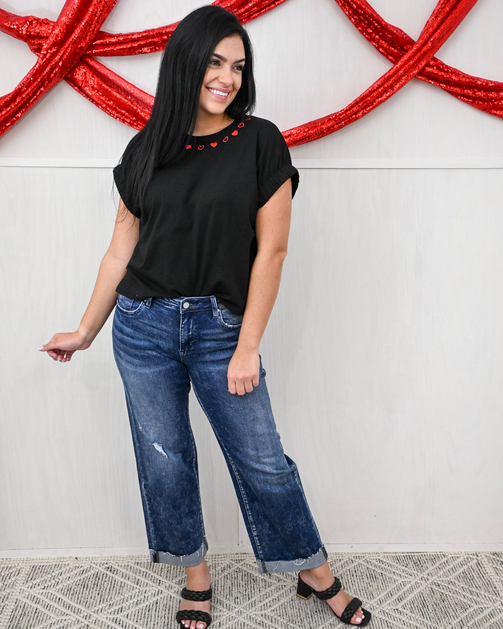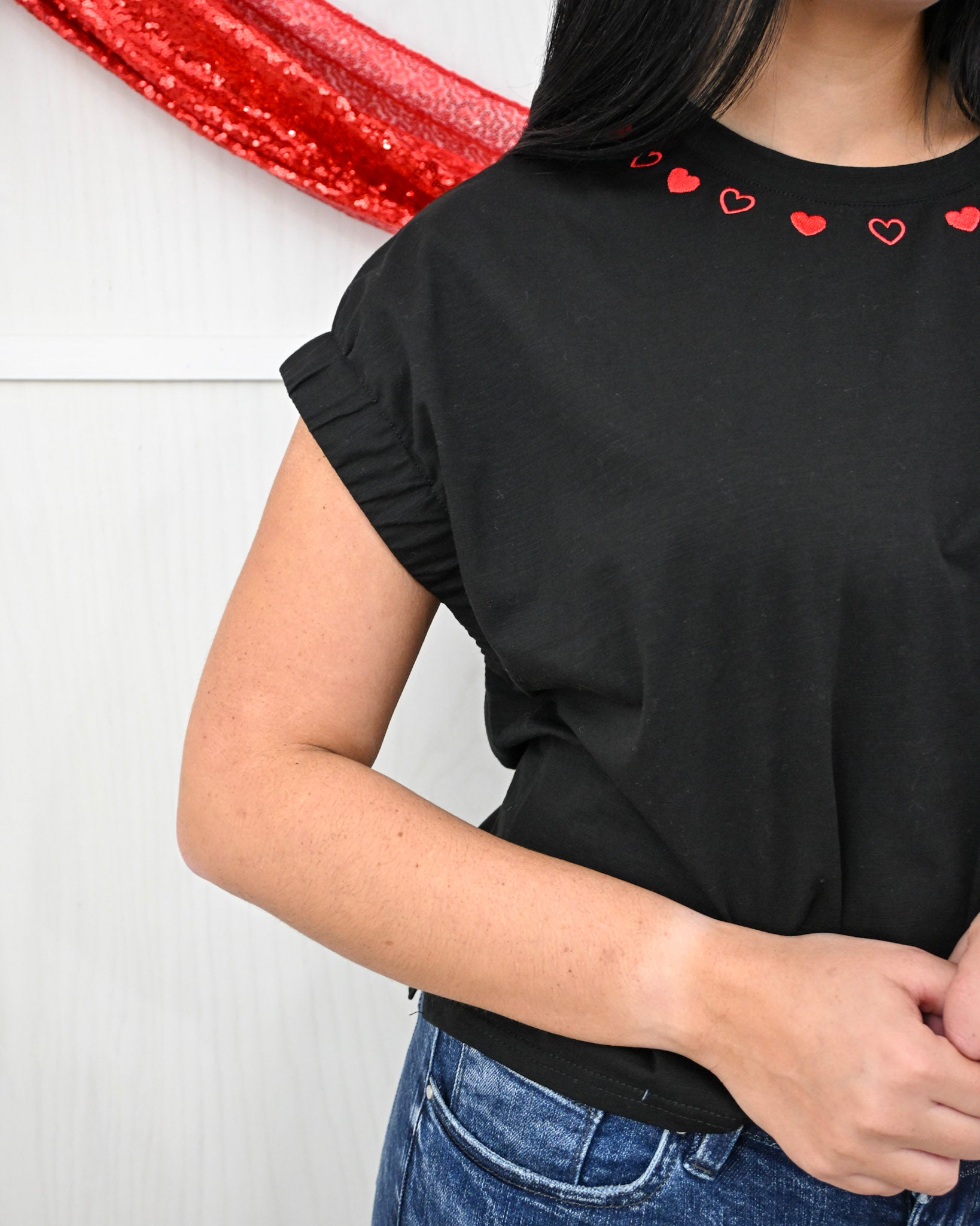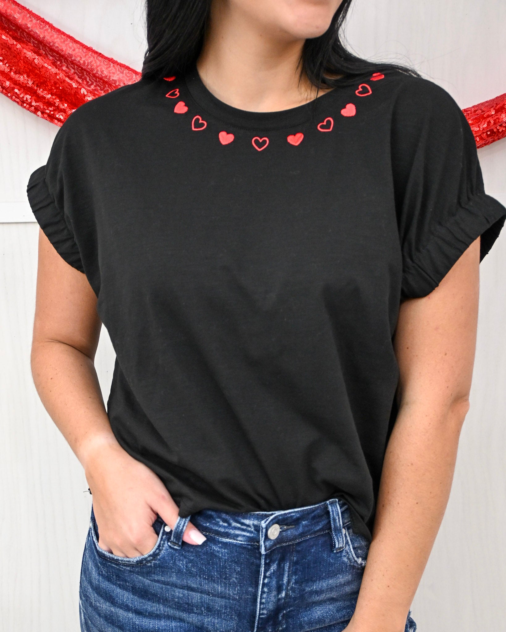 Sweet with a subtle edge, the Align Your Heart Top is proof that the little details make the biggest impact. Designed with a classic black base and finished with delicate red heart accents along the neckline, this top brings a playful, romantic twist to an everyday essential.