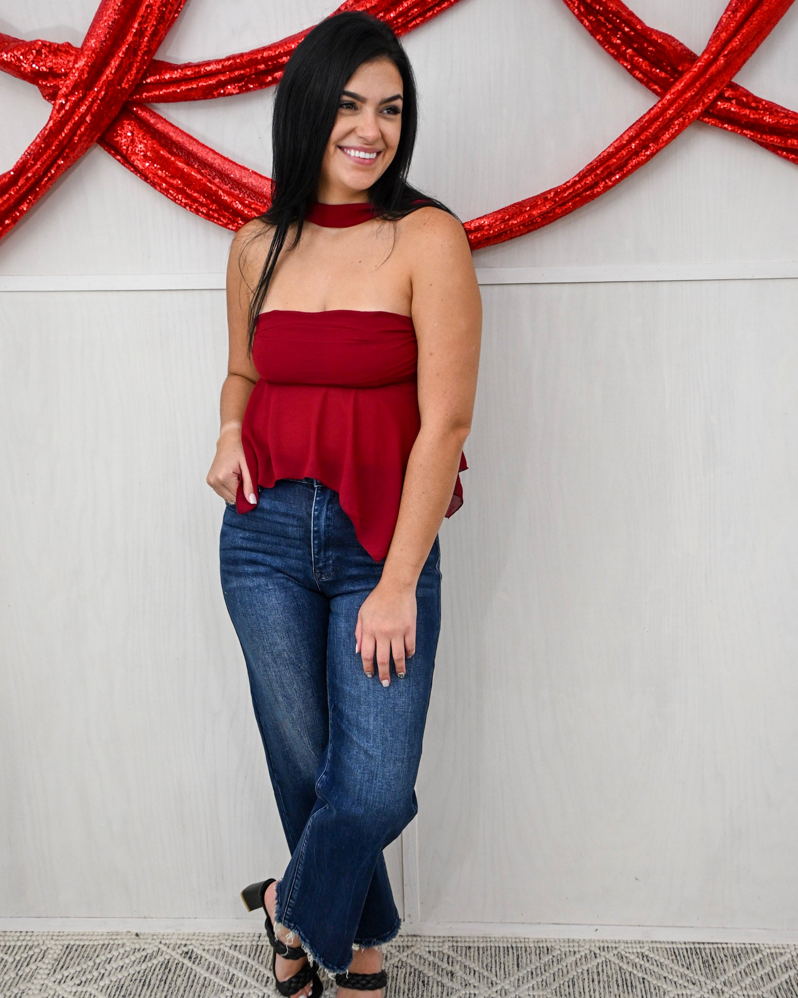 Bold, feminine, and undeniably captivating—the Crimson Kiss Smocked Back Top is made for moments when you want to stand out without saying a word. Featuring a strapless silhouette paired with a built-in choker neckline, this top creates a striking, fashion-forward look that feels both modern and timeless.