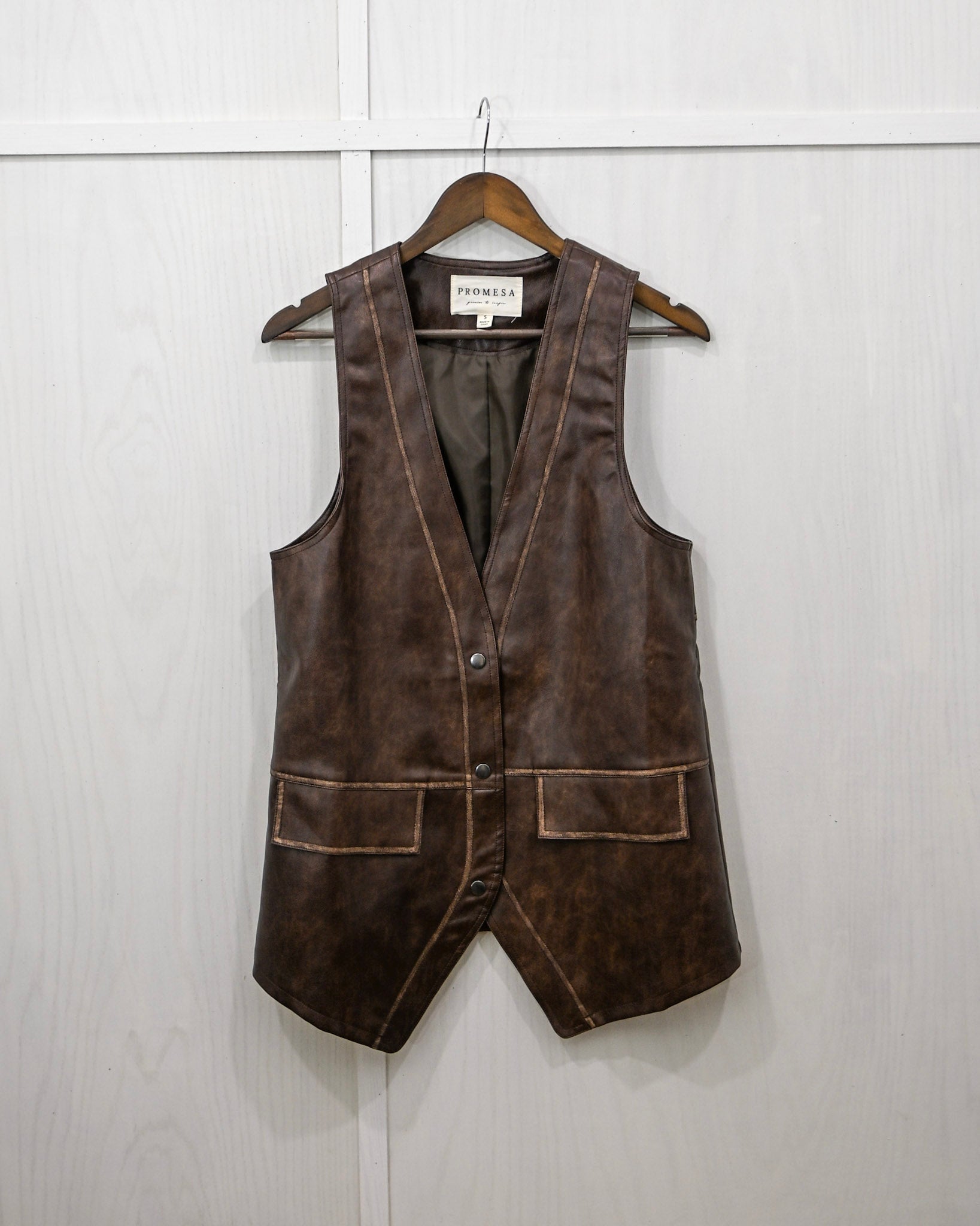 This brown faux leather utility vest is the definition of effortless layering with attitude. Designed to add instant structure and style to any outfit, it features a rich, leather-look finish that elevates even the simplest basics.