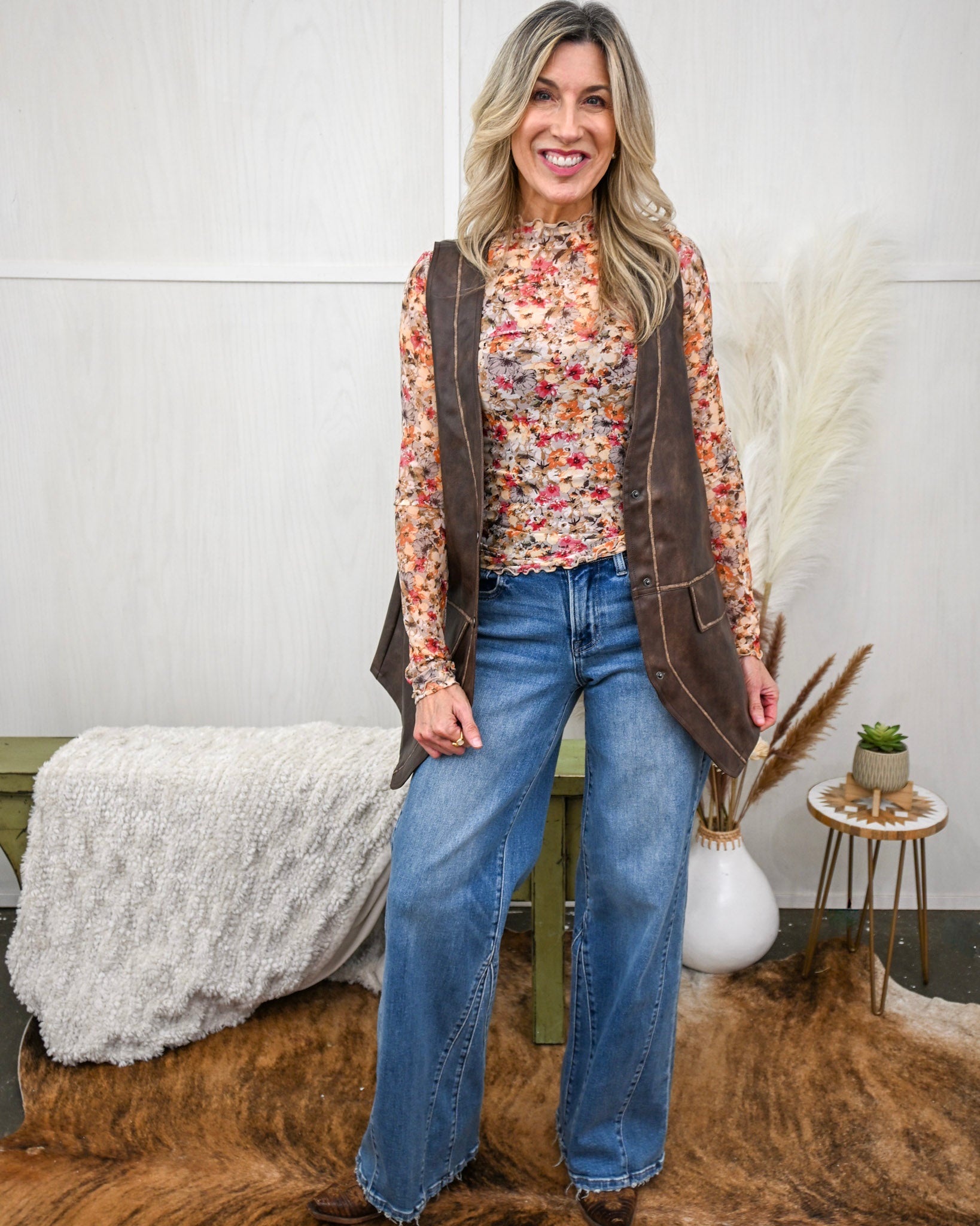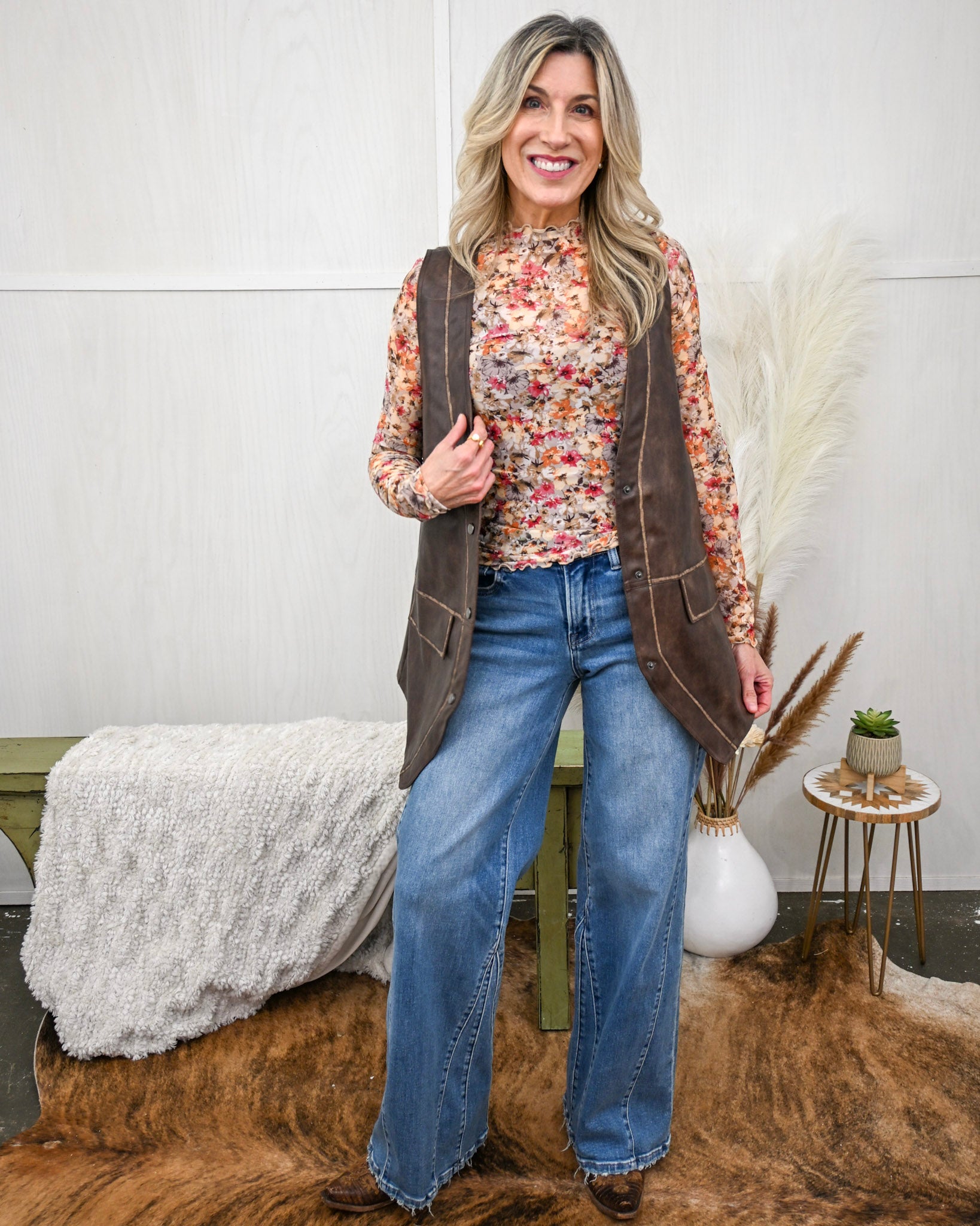 Layer it over tees, long sleeves, or lightweight sweaters for a polished, boutique-worthy look. With its flattering length and functional pocket details, this vest brings just the right balance of rugged charm and feminine edge — perfect for everyday wear, fall styling, and beyond.