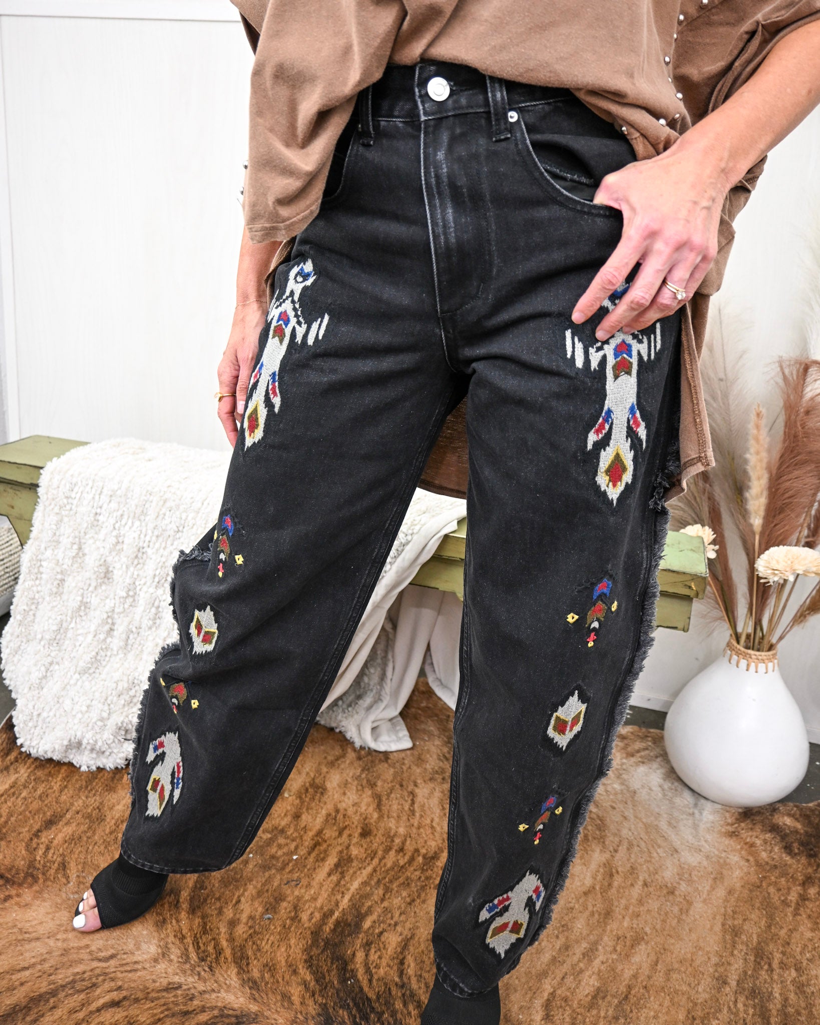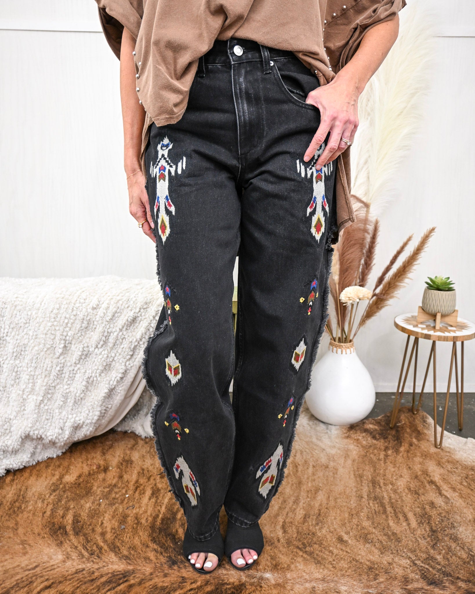 Bold, confident, and unapologetically cool—The Midnight Mesa Embroidered Pants are made for women who want their outfit to do the talking. Crafted in a washed black denim and detailed with striking Southwestern-inspired embroidery, these jeans bring a modern western edge to everyday styling.