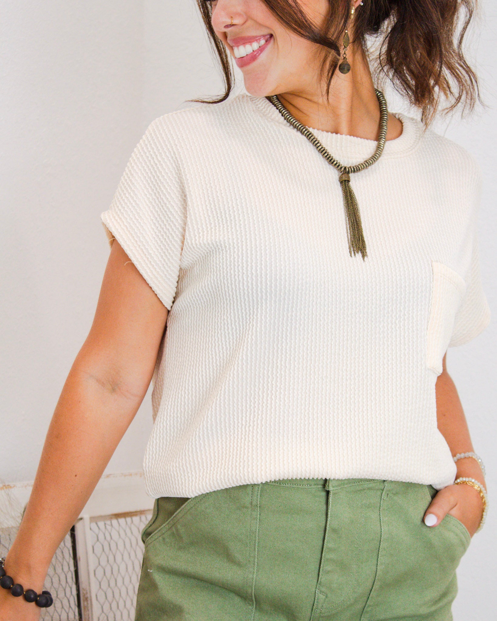 Say hello to your new go-to top! This soft cream beauty features a waffle texture, a flattering relaxed hem, and a cute chest pocket for just the right touch of detail. It’s effortlessly chic—ready to pair with anything from cutoffs to wide-leg denim.