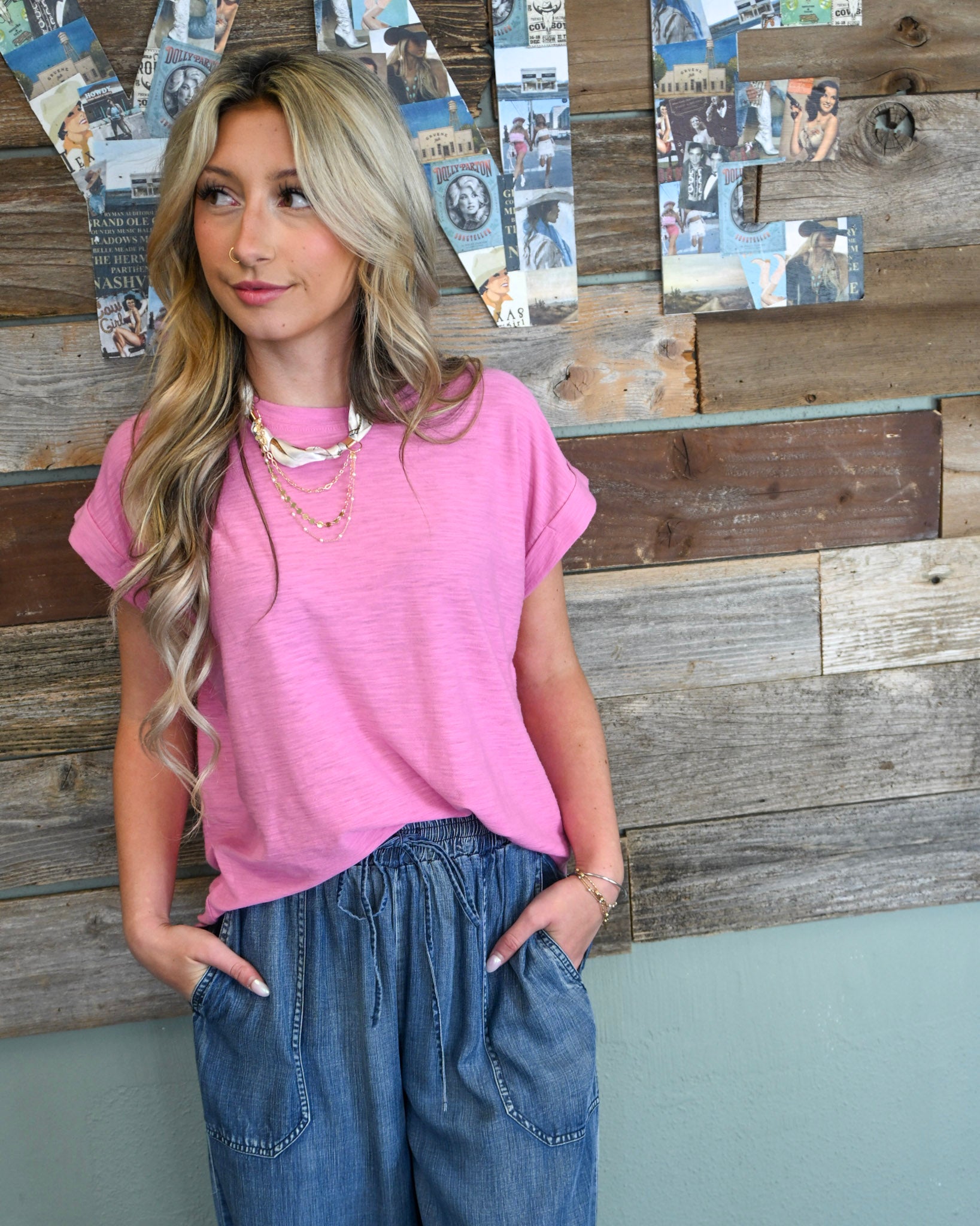 The vibrant pink hue adds a fun, feminine pop to your everyday wardrobe—making it anything but basic. Whether you’re running errands, heading to brunch, or styling it up with accessories, this tee keeps your look polished without trying too hard.