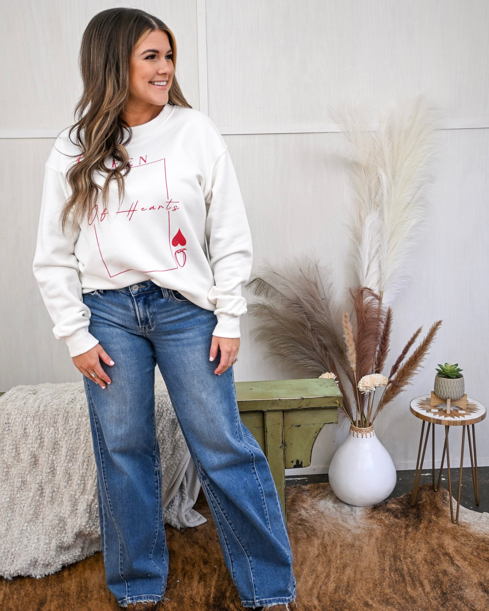 Cozy meets cute in this Queen of Hearts Graphic Sweatshirt—the perfect blend of comfort, charm, and subtle Valentine-inspired flair. Designed with a clean white base and a bold red heart card–style graphic, this sweatshirt brings playful personality to your everyday wardrobe while keeping things soft, relaxed, and effortlessly stylish.