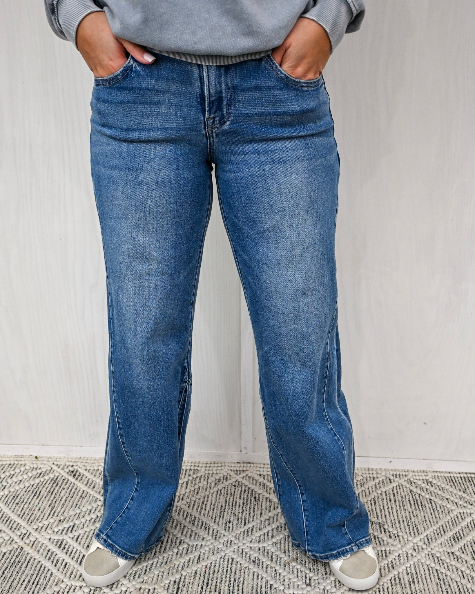 Meet your new go-to jeans—the pair you reach for when you want comfort, confidence, and effortless style all in one. The Cruz Mid Rise Wide Leg jeans feature a timeless medium wash with a flattering wide-leg silhouette that works for real life, not just the fitting room.
