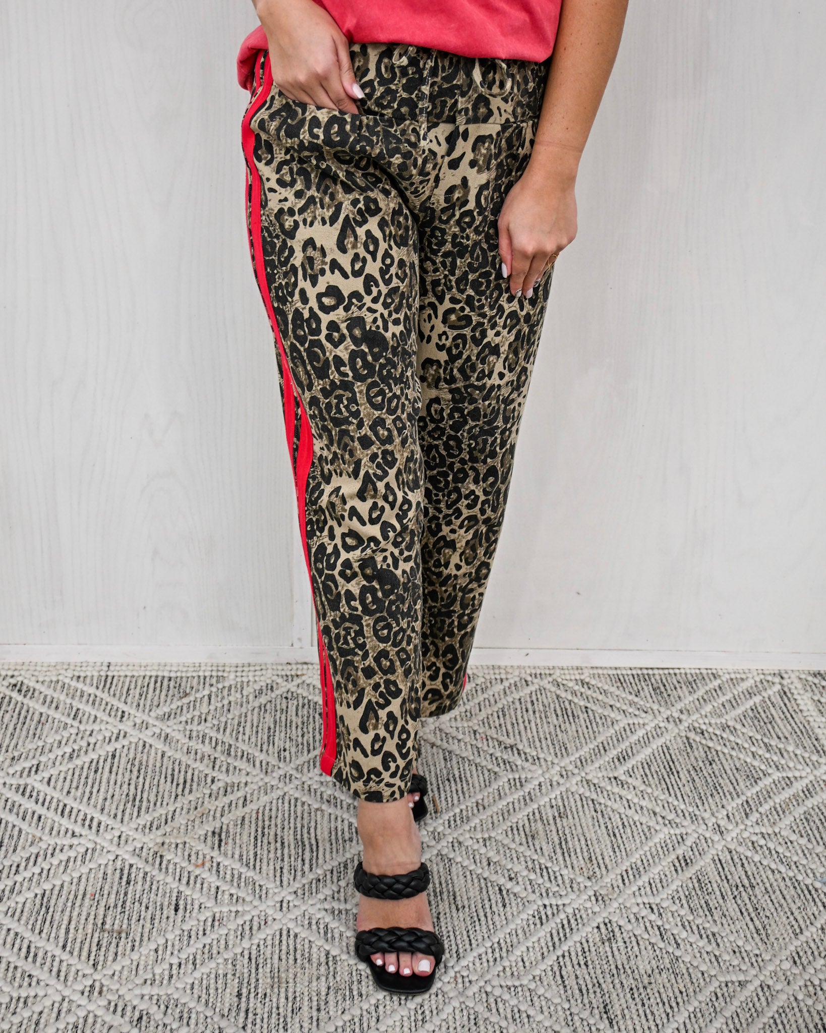 Meet your new statement staple. The Walk the Line Leopard Pants bring bold personality and effortless comfort together in one standout piece. Designed with a classic leopard print and finished with a sporty red side stripe, these pants strike the perfect balance between laid-back and fashion-forward.