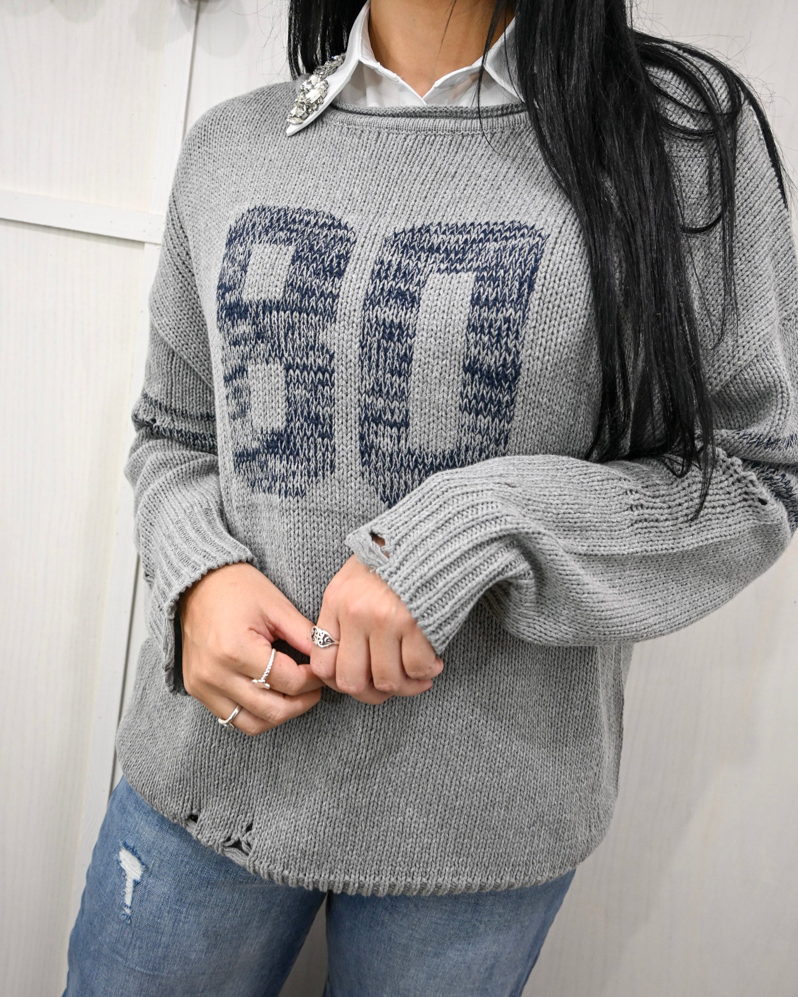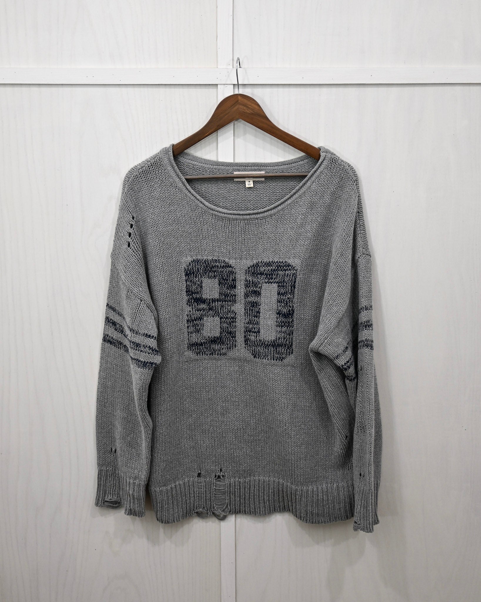 Casual comfort meets effortless cool in this grey varsity knit sweater — the kind of throw-on piece that instantly makes your outfit feel styled. Featuring a bold “80” graphic across the front and subtle stripe detailing on the sleeves, this sweater brings sporty vibes with a boutique twist.