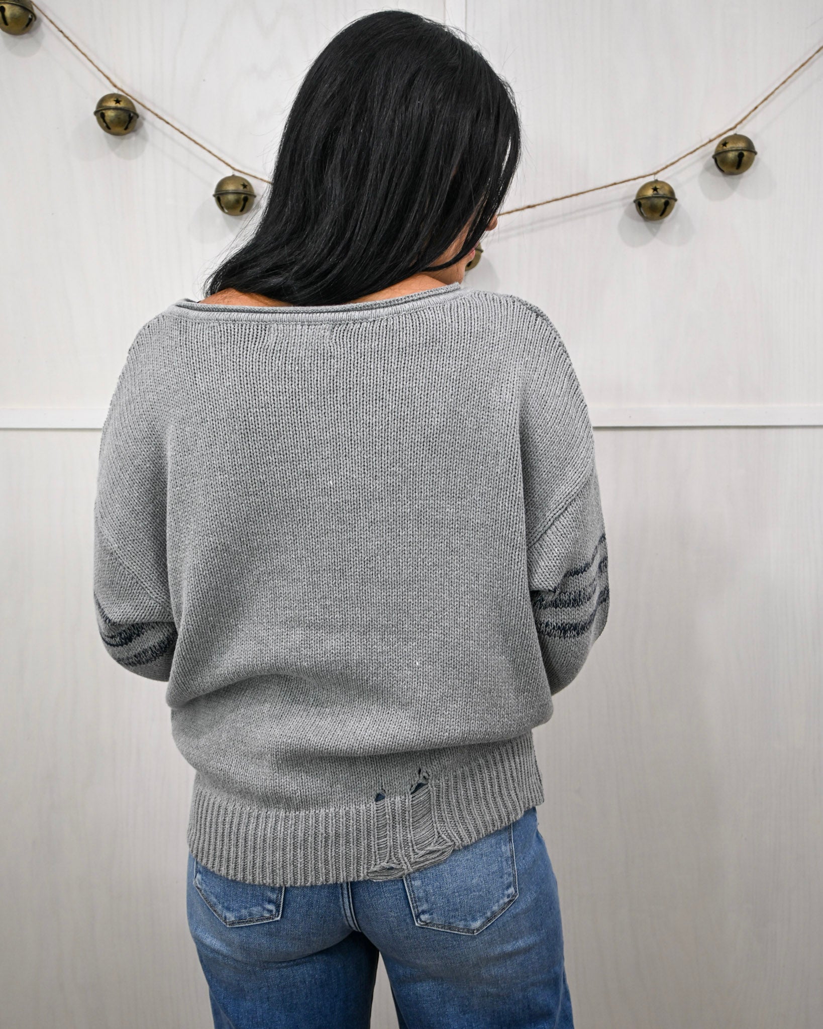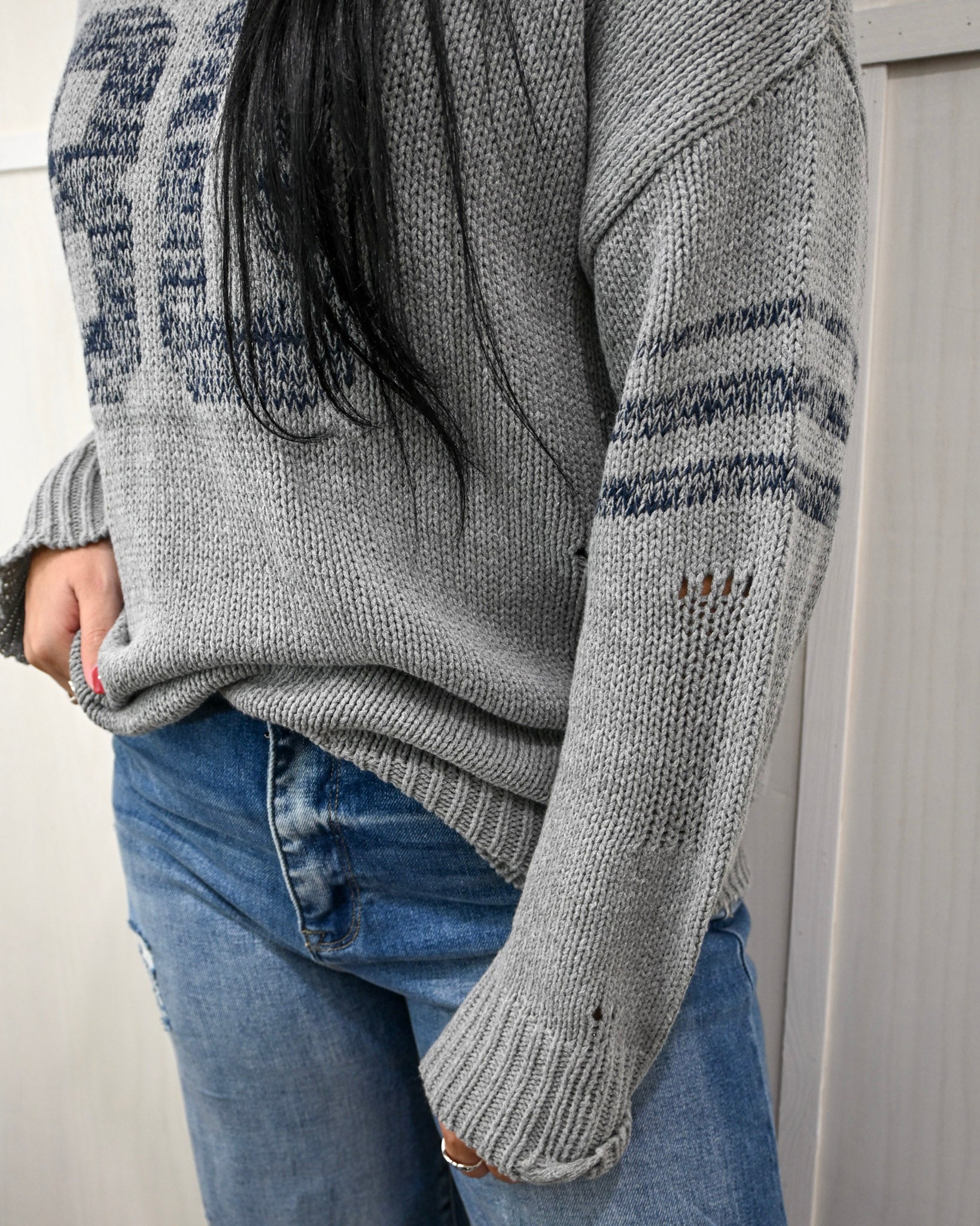 - Details: Mild Distressing, Ribbed Cuffs