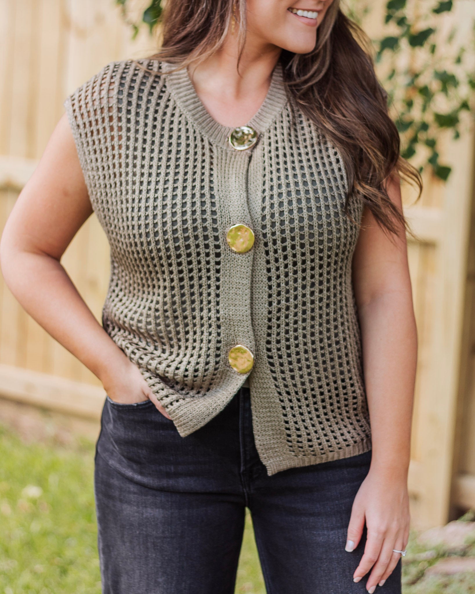 Slip into effortless charm with the Soft Whisper Vest in a classic olive — a breathable, open-knit layer that brings casual sophistication to any look. Designed with oversized gold metal buttons and a relaxed silhouette, this vest is perfect for transitional weather and layering over tanks, tees, or dresses. Whether you're headed to brunch or the boutique, this top adds texture and polish with ease.